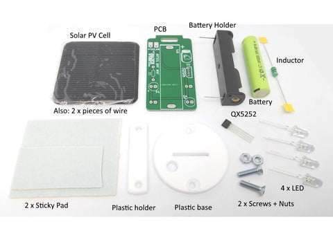 It is based on the QX5252 solar lamp integrated circuit, which takes care of charging a nickel metal hydride (NiMH) cell from a small solar panel. It also uses the solar panel output voltage to control when the light switches on. It is also a step-up converter to supply the correct current and voltage to the LEDs, so we can drive four white LEDs from just a single NiMH cell.